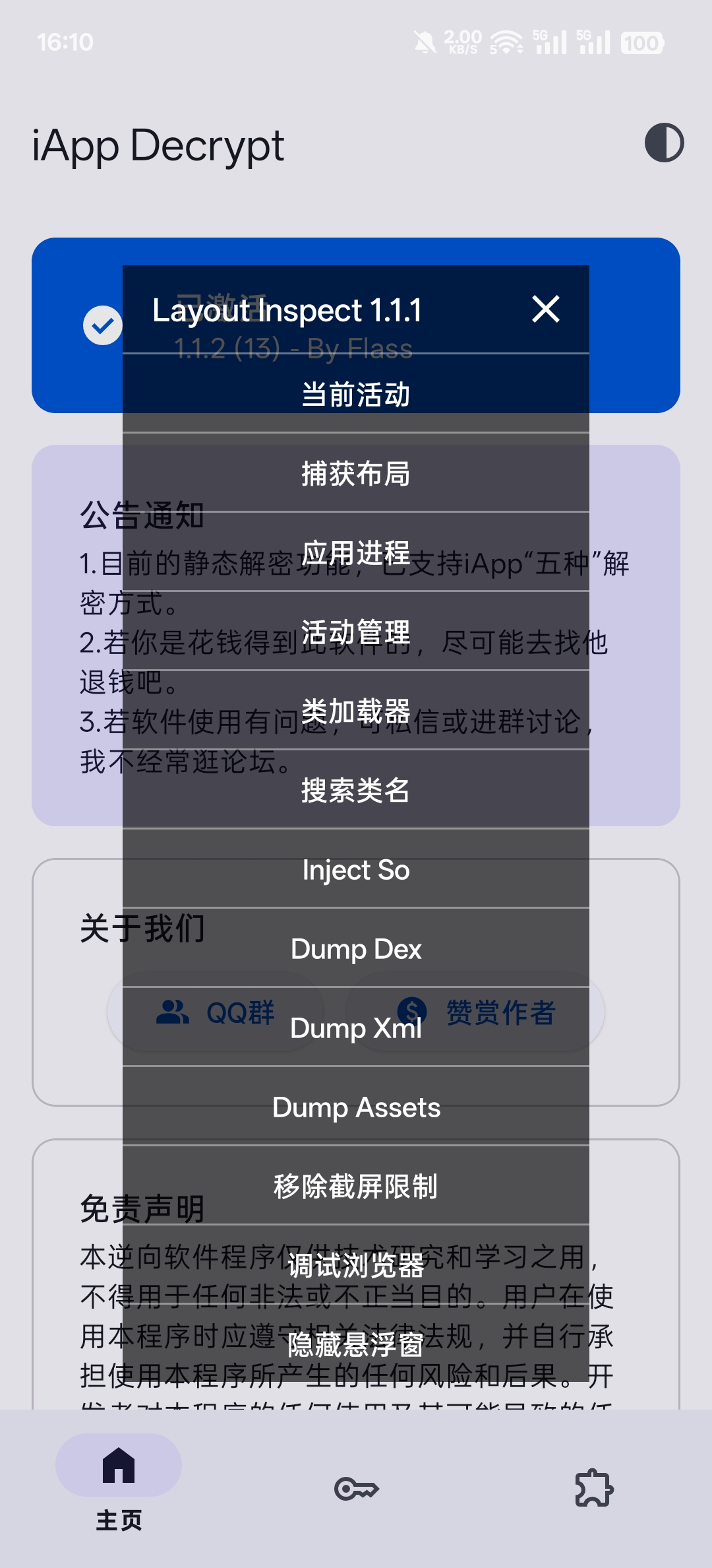 Layout Inspect是一款逆向必备的工具:它可以获取当前活动、快速捕获布局、查看应用运行进程、强制打开Activity、类加载器的枚举、搜索动态加载的类名、注入So文件、自定义Dex脱壳、Asset资源解密、XmI资源解密、移除截屏限制、以及浏览器调试等等